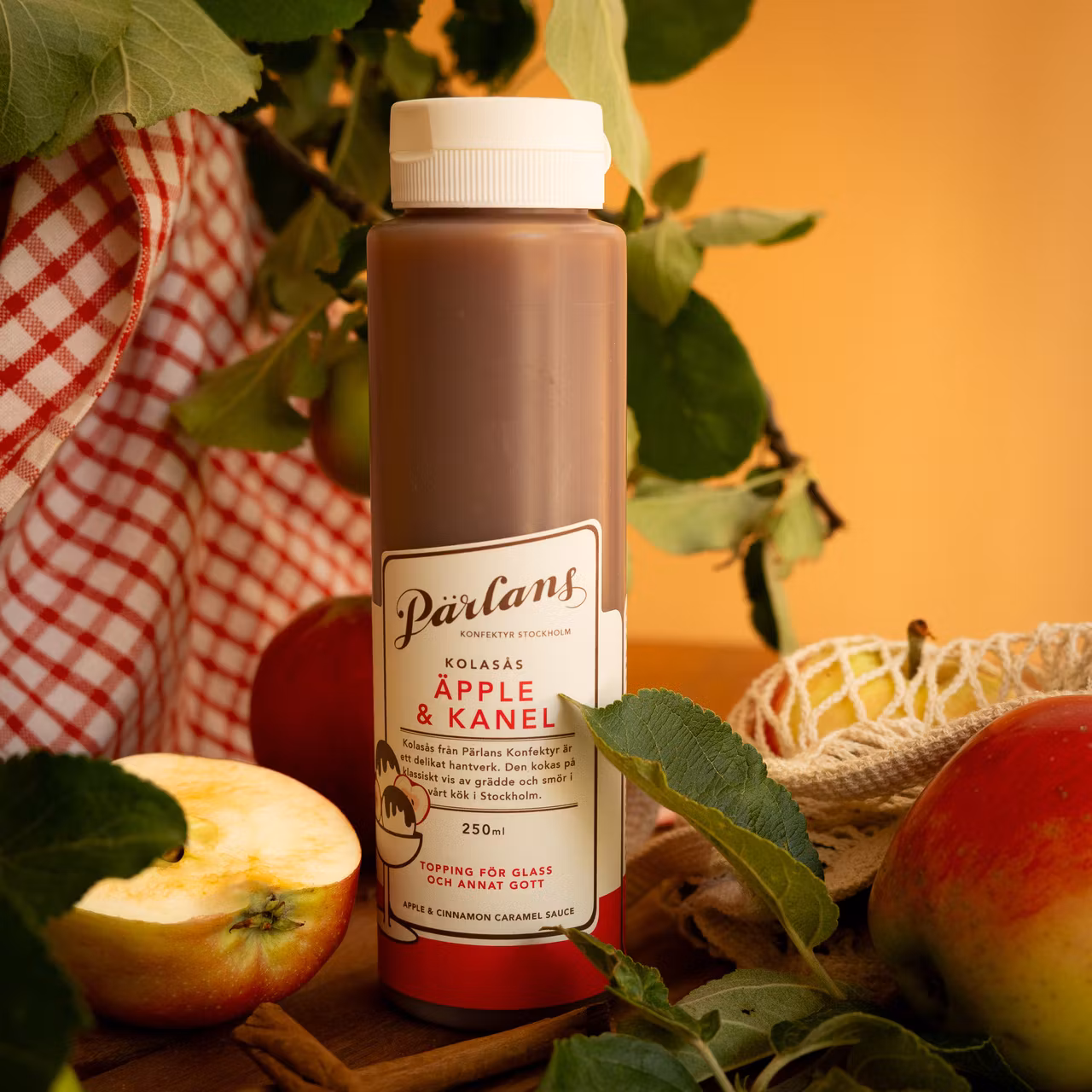 I lager. Kolasås äpple & kanel 119 kr Köp nu Artikelnummer: 432 Leverantör: Kolasås från Pärlans konfektyr i höstens smak, äpple och kanel - här i en liten squeeze tub för att snabbt och enkelt kunna ha på sin efterrätt, 250gIngredienser: Socker, grädde, glykossirap, äppeljuice, smör, limejuice och kanel.